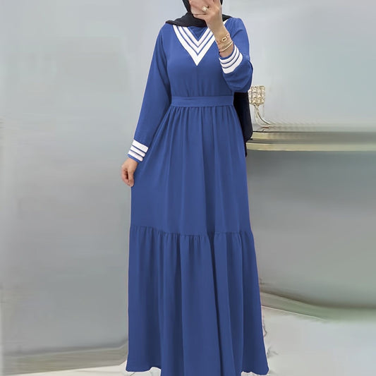 MS511#Solid color V-neck metal trim long sleeve high waist long dress