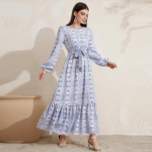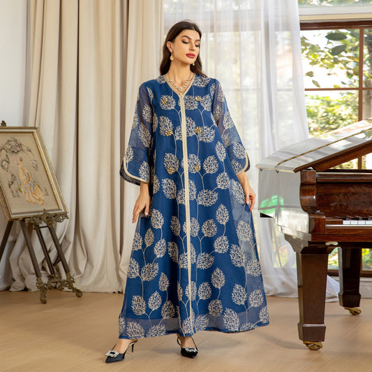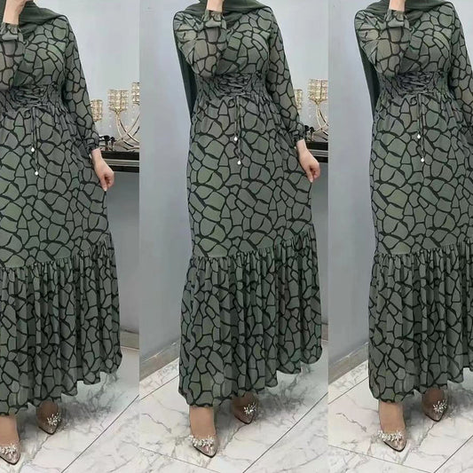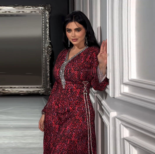MS529# Muslim Arabic print dress, diamond-encrusted sparkling robe, Eid al-Adha home wear