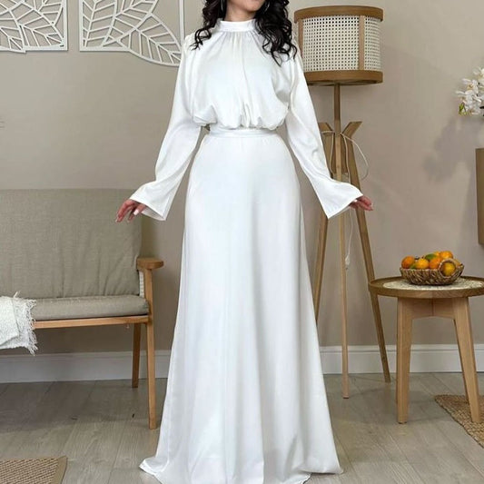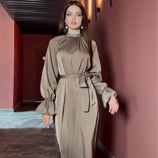 MS510#Satin style semi-high neck lace-up long sleeve high waist A-line skirt fashion dress