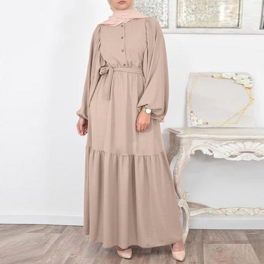 MS373#Women's Muslim shirt casual belted dress with puffed sleeves