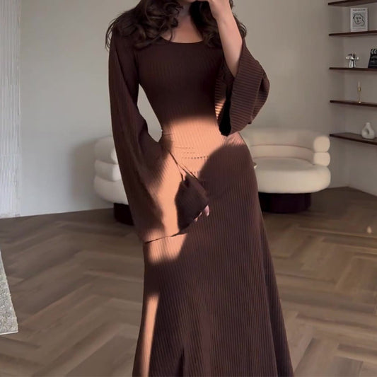 MS591#Temperament Elegant Pleated Skirt Solid Color Round Neck Long Sleeve Pleated Dress