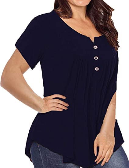 FS312#Women's Plus Size Tunic Tops Summer Short Sleeve V Neck Blouses Ruffle Flowy Button Up T Shirts