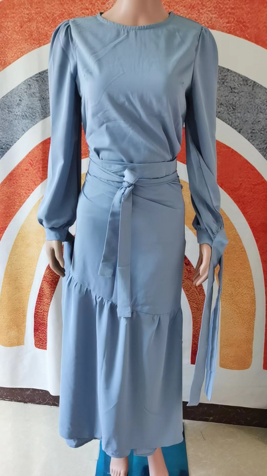 MS367#Conjunto de falda de color liso con camisa de manga larga con cordones a la moda