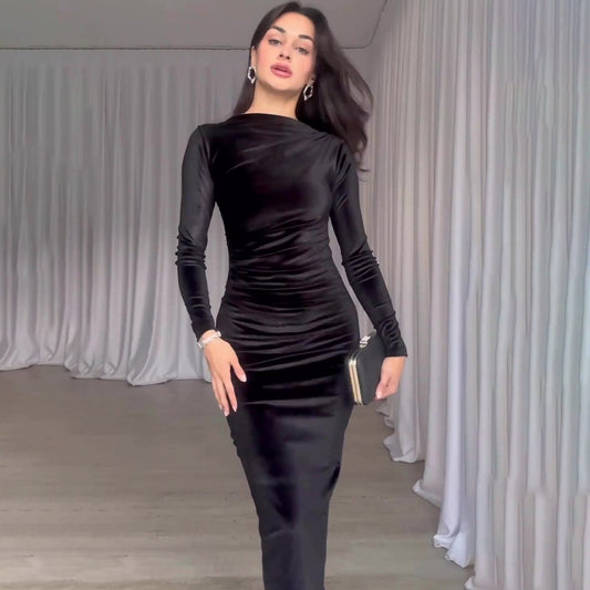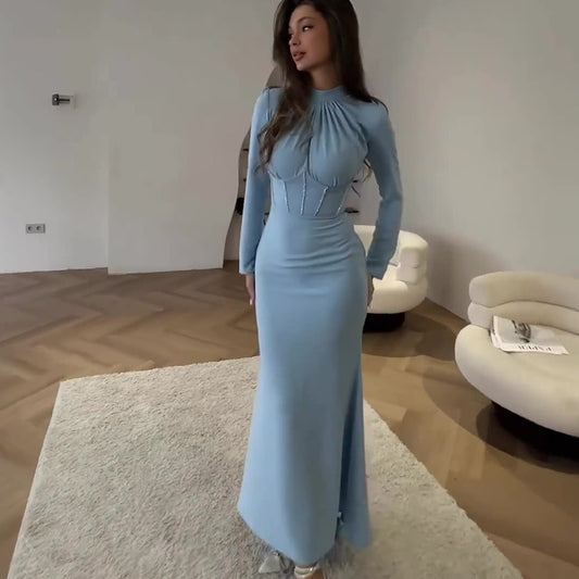 MS447#Vestido de mujer plisado de manga larga con abertura de moda